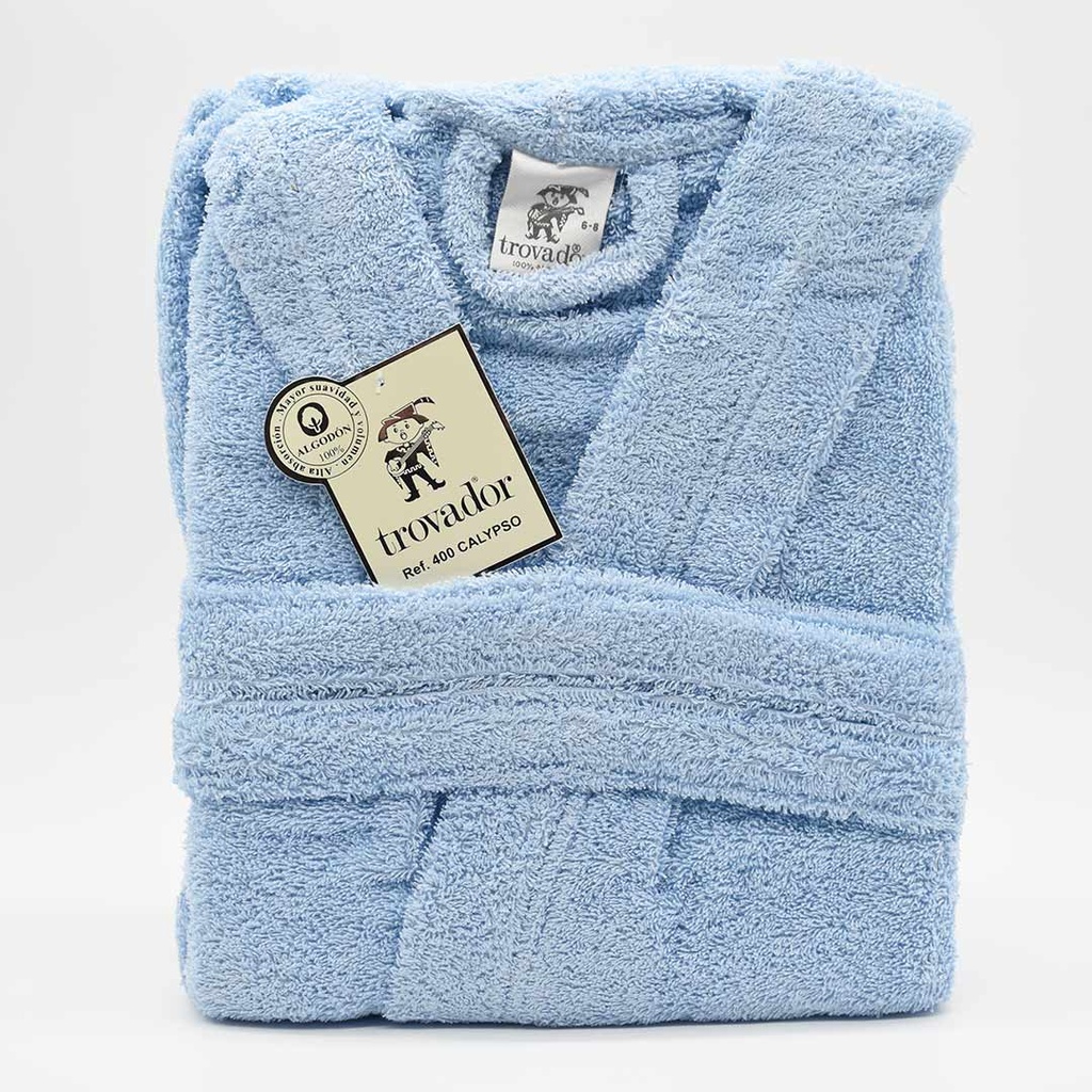 Albornoz infantil Calypso de Trovador en color azul claro, con capucha para poder secarle el pelo a los niños después del baño. El albornoz tiene cuello smoking, capucha, dos bolsillos y cinturón para ajustar a la cintura. Está confeccionado en 100% algodón, con un tejido de 400gr/m2 muy suave y absorbente.