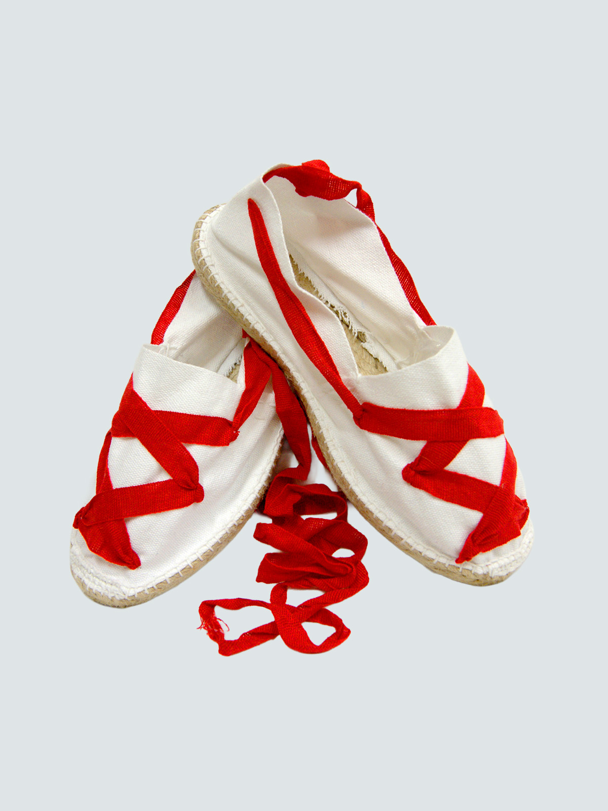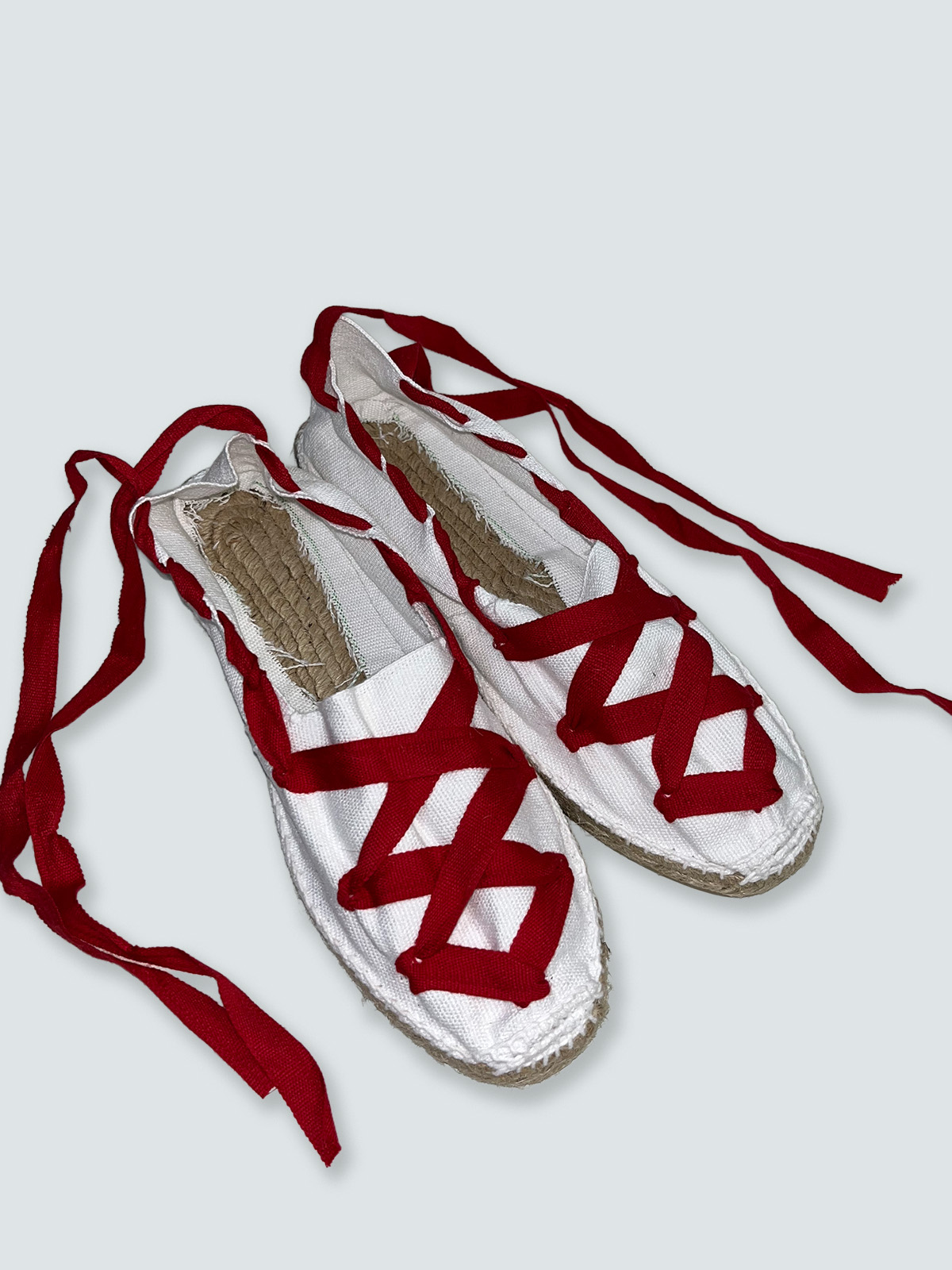 Alpargata artesanal blanca con cintas rojas, suela de cañam y tela de algdon, cintas de raso