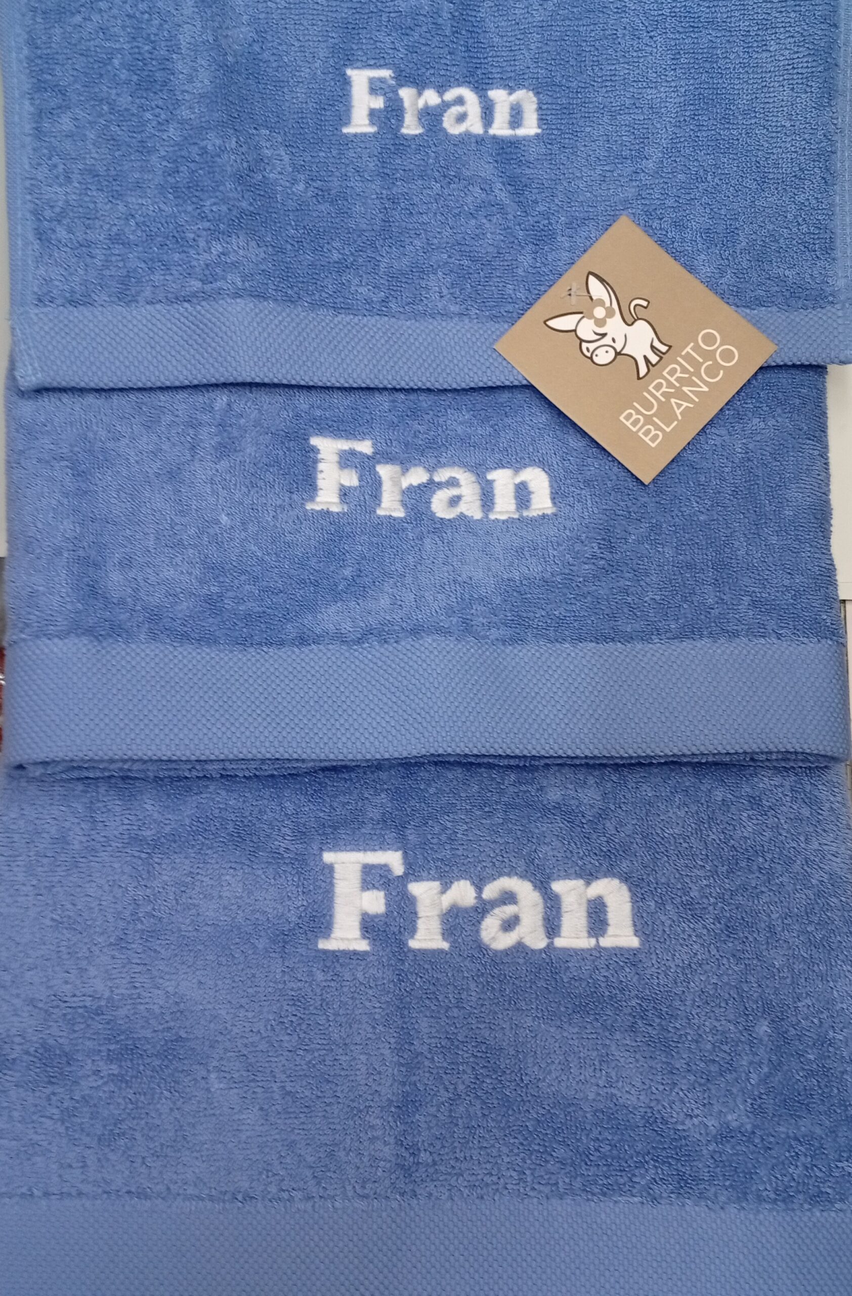 Juego de toallas 100% algodón, de la marca Burrito Blanco. Juego de toallas lisas con cenefa jaquard, confeccionada en 100% algodón de rizo americano con un gramaje de 500 gr/m2. Compuesto de una toalla de tocador (30×50 cm), una de lavabo (50×100 cm) y una de ducha (70×140 cm).