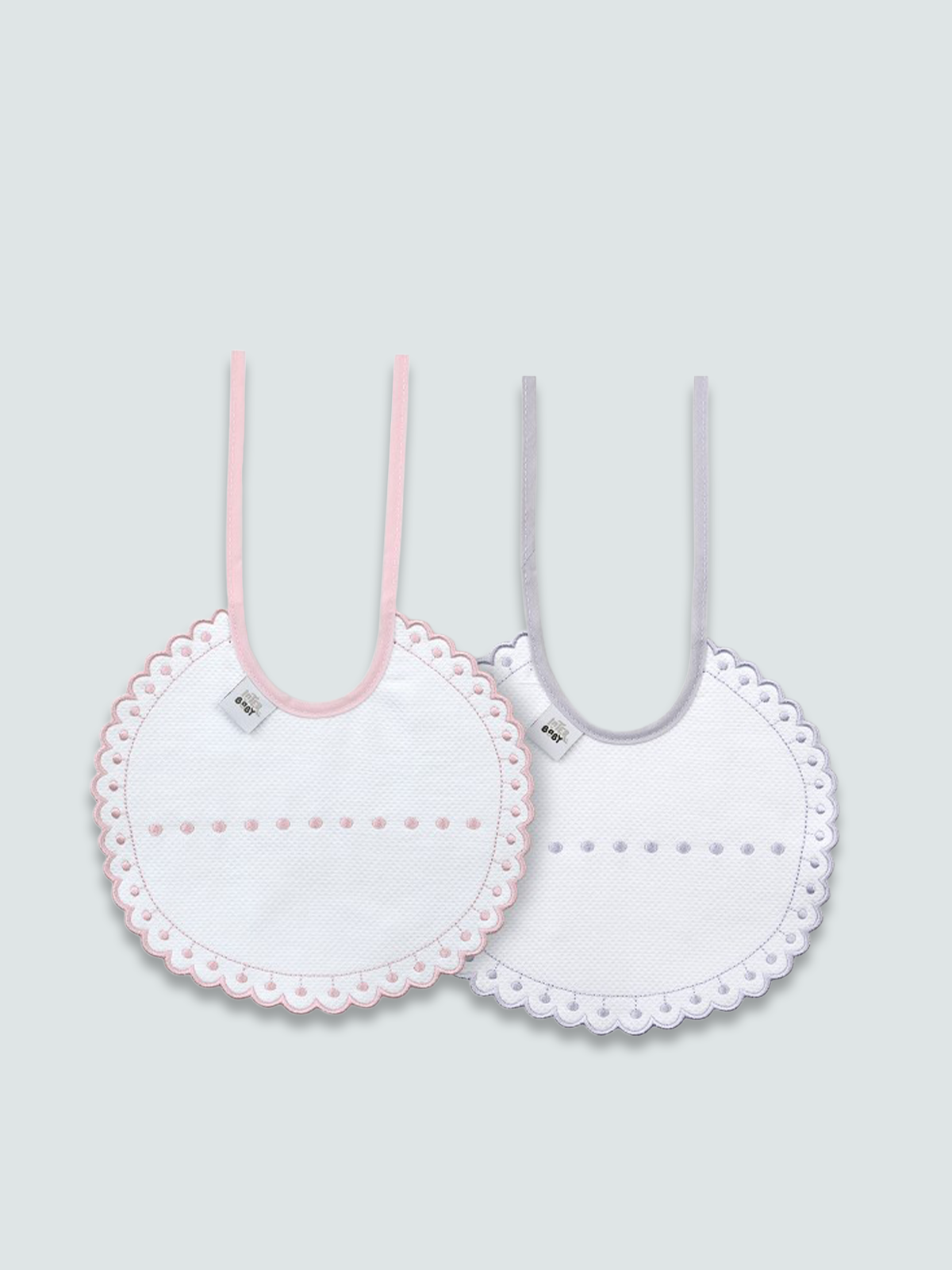 Uno de los baberos de color blanco y otro blanco-rosa, ambos con estampado de puntito