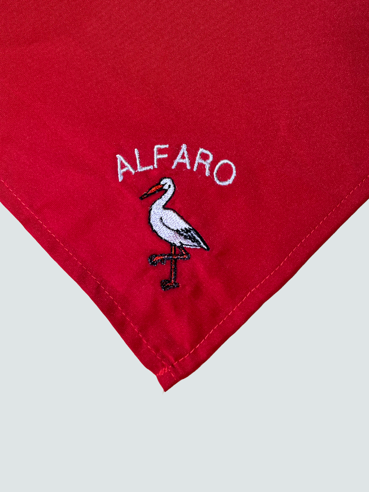 Pañuelo de crespón rojo, en forma de pico, con delicado bordado de la cigüeña de Alfaro. Suave y ligero, ideal para bebés.